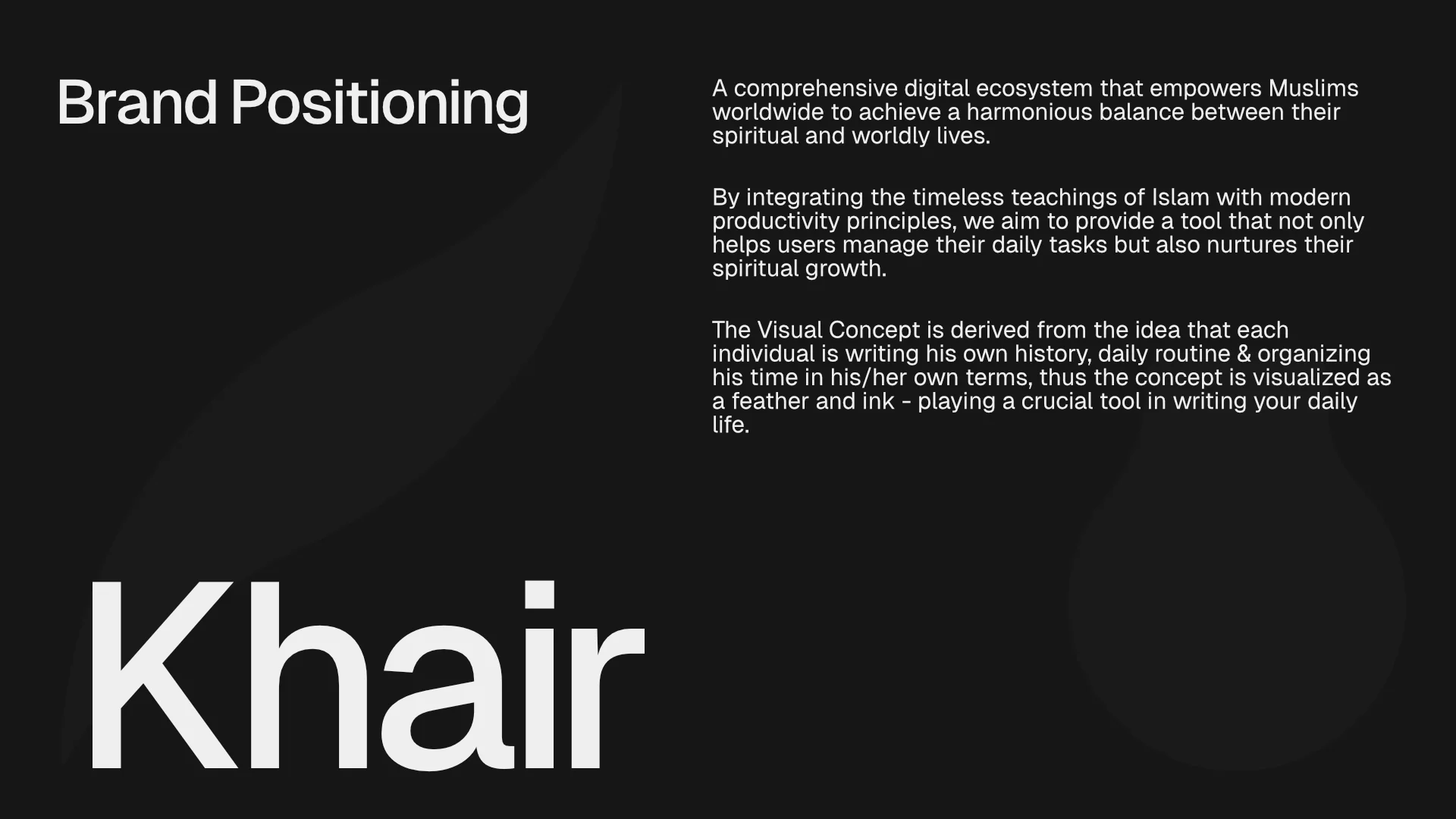 The Founder reached out to me and needed a full Brand Strategy, Art Direction & Brand Design engagement on this project. I’ve designed the Logo based on the imagination of a feather and ink (referring to an old Arabic pen). My whole concept with naming the Brand & the Art Direction as well as the Logo Design was to bring the idea that each individual is writing their own history on a daily basis and thus making a pragmatic, proactive and organised life. The word ‘‘Khair’’ that I came up with - primarily in Arabic means: goodness, well-being, benefit.